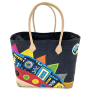 This unique tote bag is made entirely from natural raffia, with hand-embroidered motifs adding a touch of authentic craftsmanship.