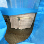 This unique tote bag is made entirely from natural raffia, with multicoloured striped patterns in shades of blue, adding an authentic, handmade touch.