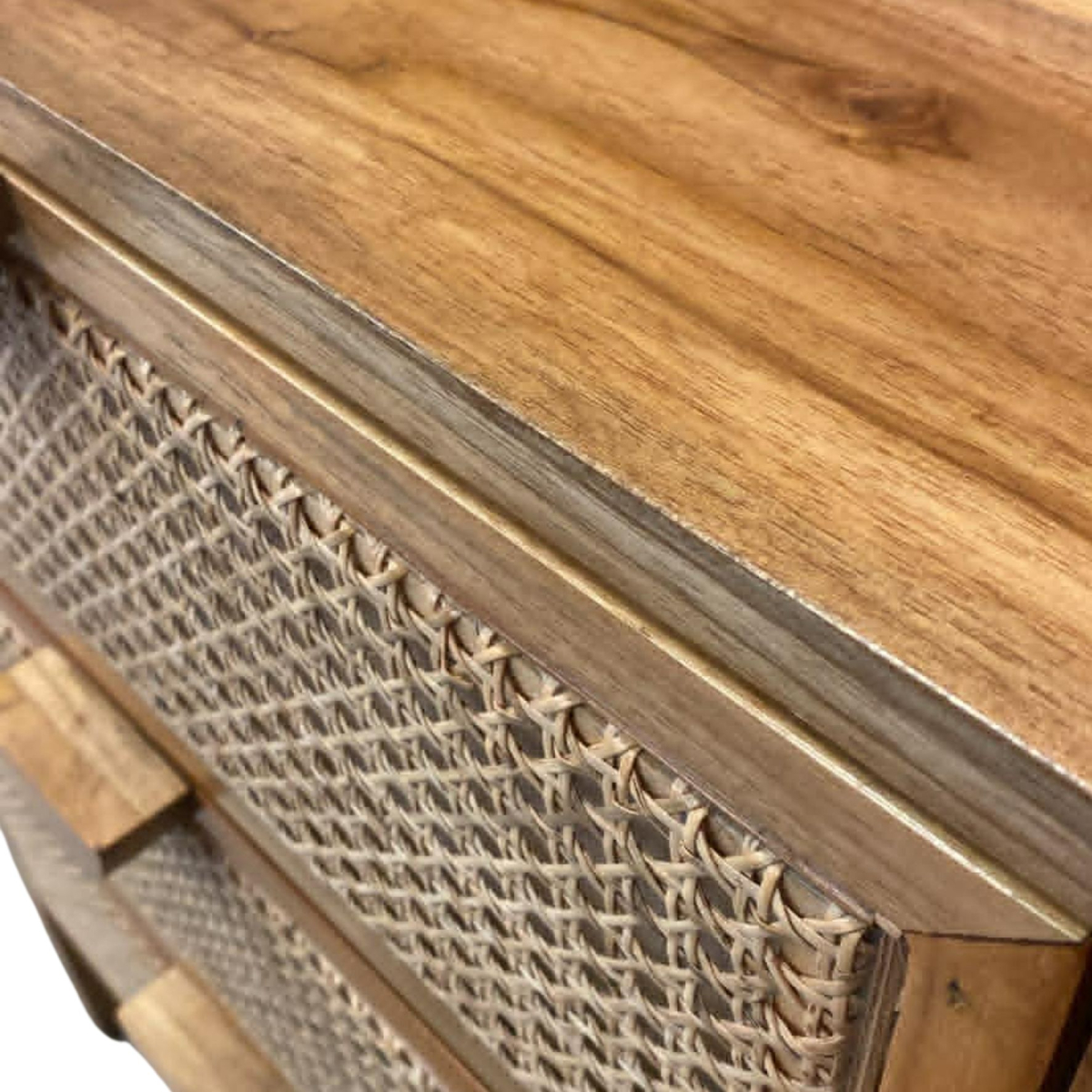 With its combination of light wood and cane, this chest of drawers is a statement piece that warms up the atmosphere of a room while adding character.