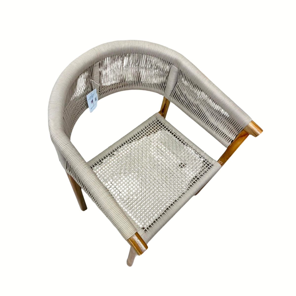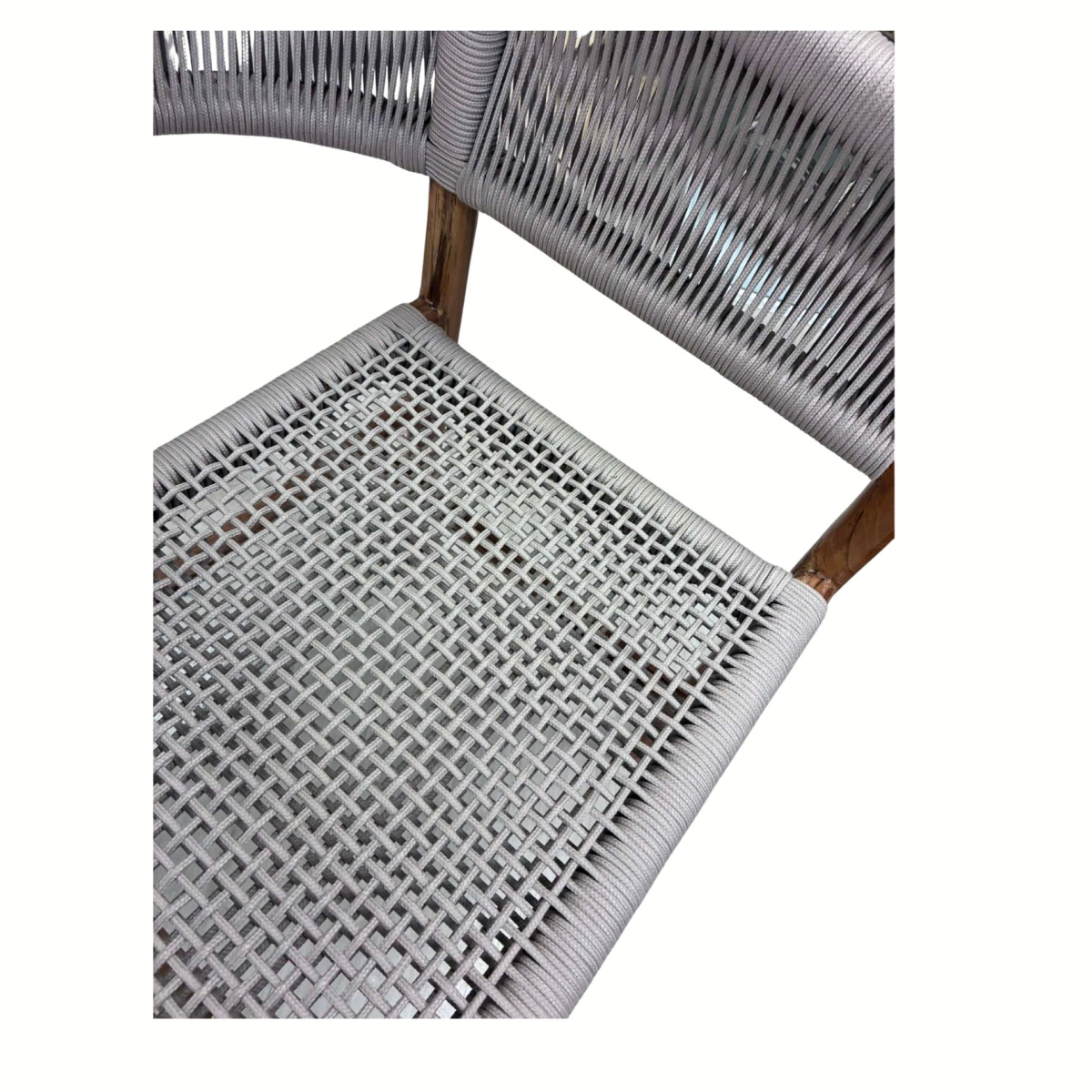 - Seat and backrest: beige synthetic rope weave (UV and weather resistant)