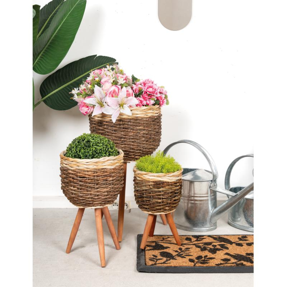 Ce cache-pot sur pied associe la robustesse du bois à la beauté des fibres naturelles. Son tressage en abaca lui confère un aspect texturé et élégant, idéal pour une décoration bohème, naturelle ou contemporaine. Sa finition marron foncé est sublimée par un liseré clair en haut, apportant du contraste et une touche raffinée. Grâce à ses trois pieds en bois, il offre une excellente stabilité tout en surélevant vos plantes pour un effet déco tendance. Le cache-pot est doublé d’un revêtement plastique, permettant d’accueillir directement vos plantes sans risque d’humidité.